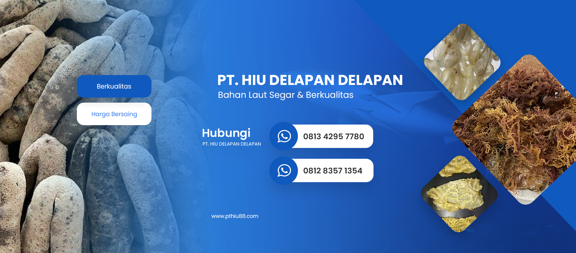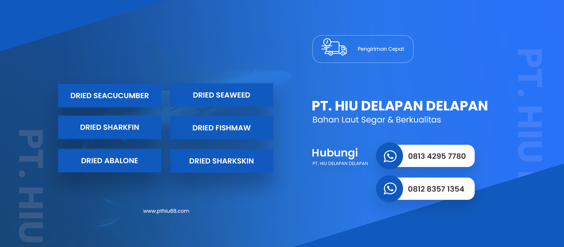 PT. Hiu Delapan Delapan adalah salah satu eksporter dan pemasok commodity laut berkualitas tinggi, yang melayani berbagai kebutuhan industri kuliner dalam dan luar negeri, dll. Kami berfokus pada penyediaan produk laut kering, beku yang diproses secara higienis sesuai standart haccp kementerian kelautan dan perikanan, dengan pengawasan ketat pada setiap tahap untuk memastikan produk yang sampai di tangan customer memenuhi standart internasional. Produk kami dikenal karena kesegarannya dan komintmen dengan kwalitas nya, nilai nutrisi yang tinggi dan beragam manfaatnya untuk berbagai industri.